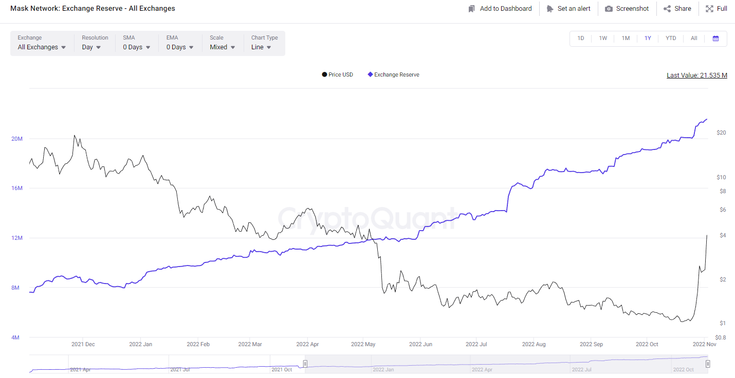 Ketersediaan token MASK di exchange pada 25 Oktober sebesar 20.011.500 MASK. Sedangkan pada 27 Oktober, tercatat ada 20.967.038 MASK yang tersedia di exchange. Dalam jangka waktu dua hari, tercatat ada 955.538 token MASK bertambah di exchange reserve.