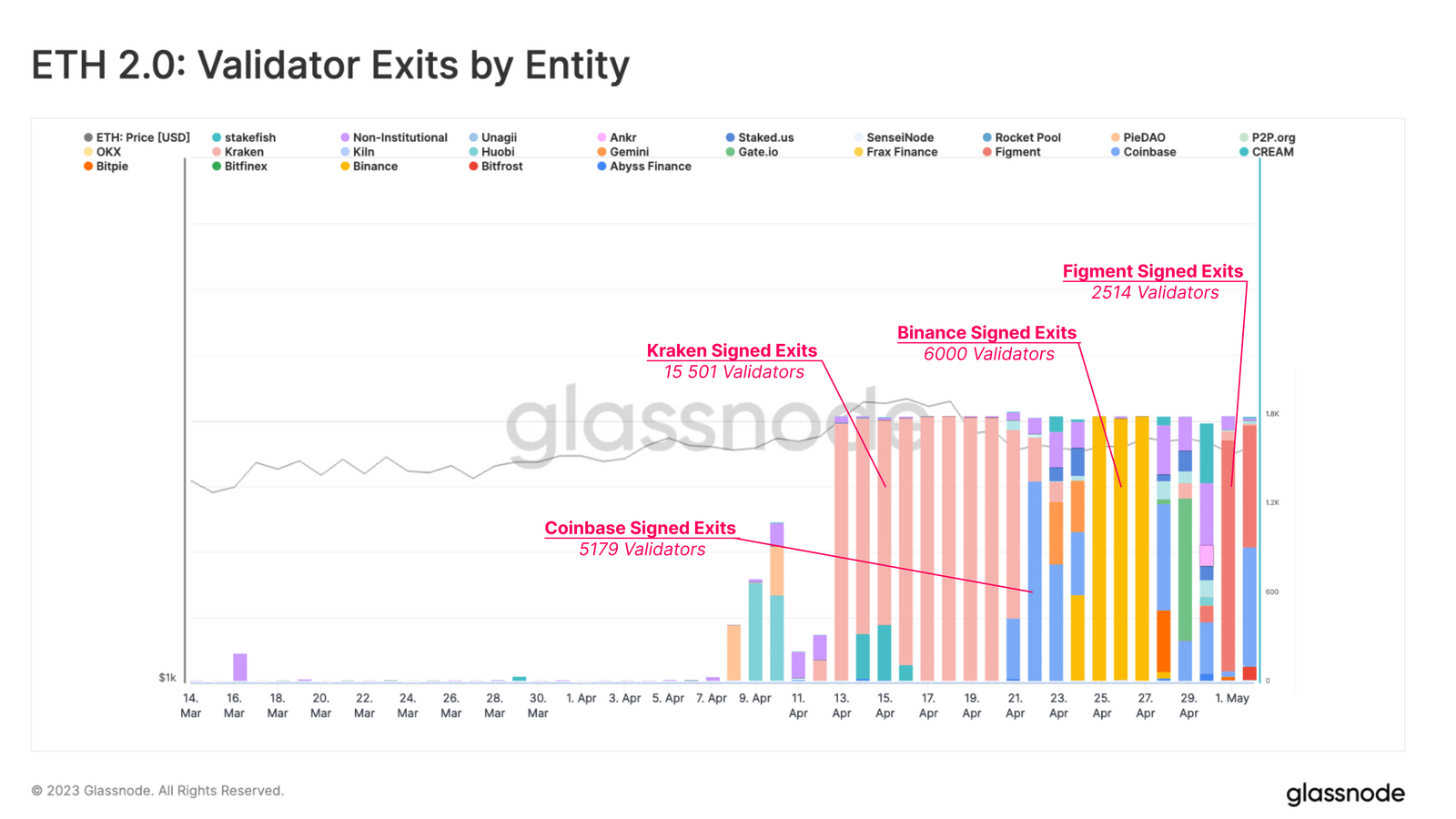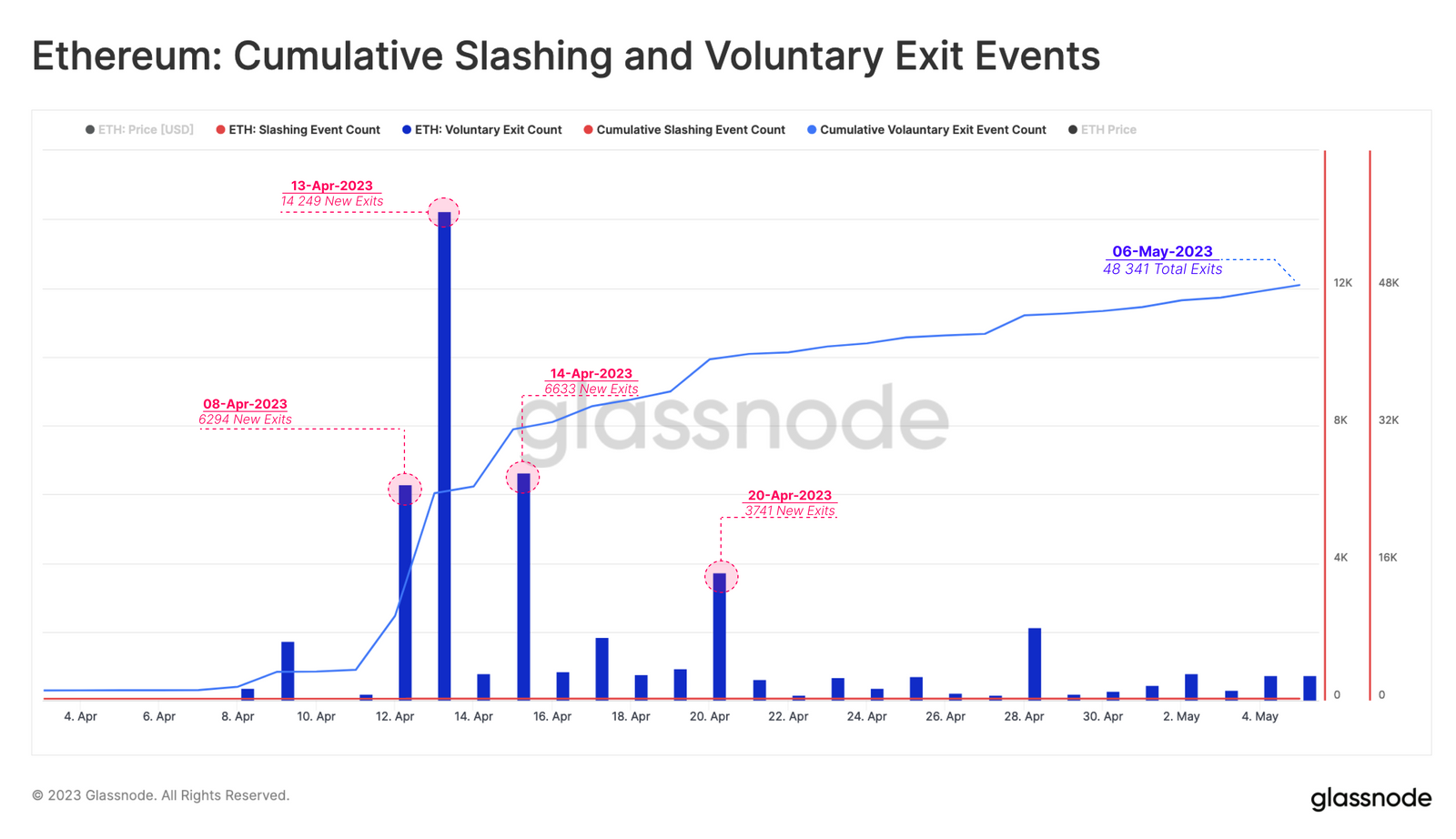 Glassnode mencatat ada 48.341 validator yang sudah memutuskan untuk keluar dari jaringan Ethereum, dengan kepemilikan 1,55 juta ETH (dari staked ETH dan rewards ETH). Arus keluar validator terbesar terjadi pada 13 April 2023, sebanyak 14.249 validator.