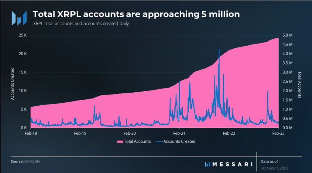 Selain karena alasan makro, kenaikan harga XRP juga dipicu oleh terus bertambahkan pengguna XRP ledger. Per 23 Februari 2023, total akun XRP ledger sudah menyentuh lima juta.