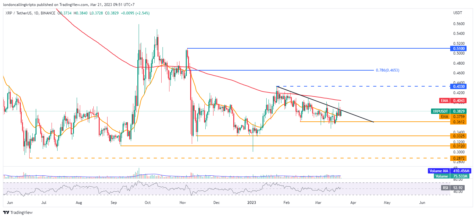 Analis Portalkripto, Arli Fauzi, telah memprediksi pergerakan harga XRP yang berhasil breakout 200-day exponential moving average (EMA), pada Selasa, 21 Maret 2023, kemarin. Menurut Arli, laju bullish XRP bisa berlanjut hingga menyentuh harga tertinggi di level $0,4330.