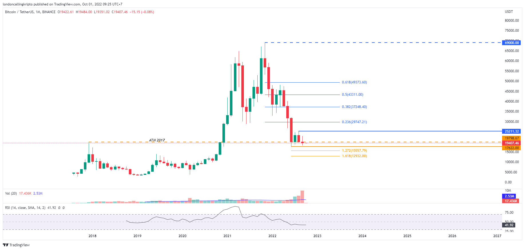 Harga terendah pada penutupan kandil bulanan September hampir mendekati major support pada level $17.622 yang merupakan harga terendah sementara pada tahun 2022.