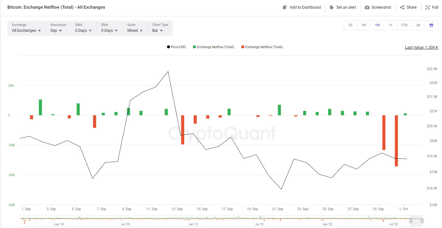Arus keluar (outflow) terlihat sangat mendominasi pada 29-30 September. Bitcoin exchange netflow ditutup negatif pada periode tersebut. Total ada 65.112 Bitcoin yang ditarik dan dipindahkan dari exchange ke wallet external pada 29 September, sedangkan pada 30 September total ada 78.999 Bitcoin yang keluar dari exchange.