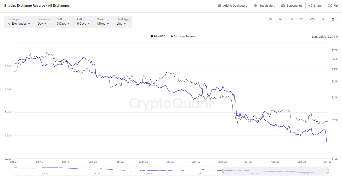 Kondisi tersebut didukung oleh berkurangnya ketersediaan Bitcoin pada exchange (exchange reserve). Data pada Cryptoquant menunjukan adanya penguranan jumlah Bitcoin periode 28-30 September. Pada 28 September Bitcoin exchange reserve tercatat sebanyak 2.328.393 Bitcoin dan jumlah tersebut berkurang cukup signifikan pada 30 September dengan jumlah 2.270.944 Bitcoin.
