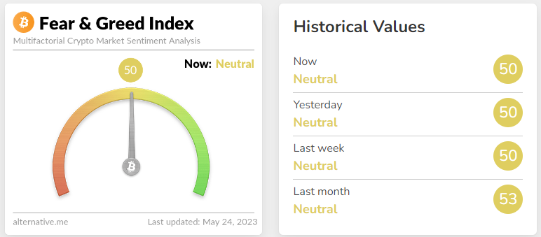 Sentimen pelaku pasar kripto masih stagnan terhadap kondisi saat ini yang bergerak datar dan cenderung mengalami penurunan. Fear and Greed Index kembali ditutup pada level 50 dengan kategori Neutral.