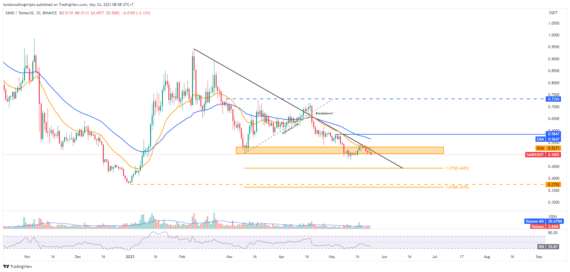 Pergerakan harga SAND berpotensi membentuk pola double boottom apabila mampu rebound dan breakout dinamis resistance yang merupakan 20-day exponential moving average (EMA) di level $0,5271.
