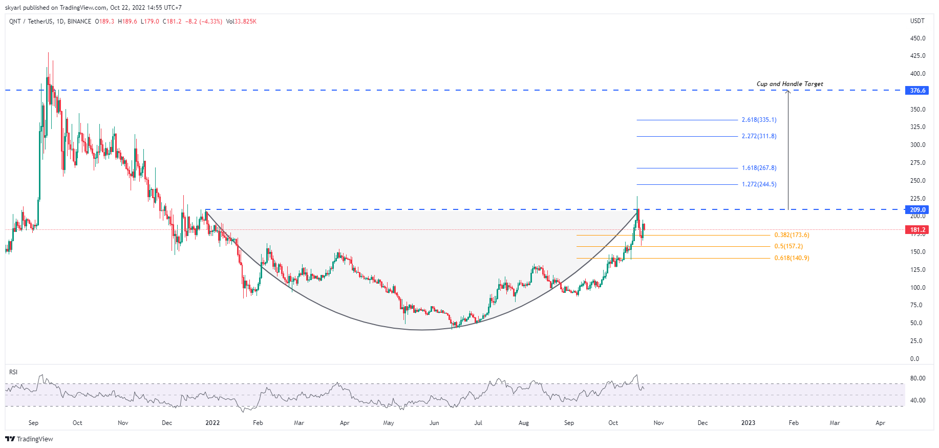 Apabila cup and handle tersebut valid, kemungkinan harga QNT akan koreksi terlebih dulu dengan penurunan maksimal di level $140. Jika harga QNT turun melebihi batas tersebut, maka cup and handle pattern tersebut bisa menjadi tidak valid.