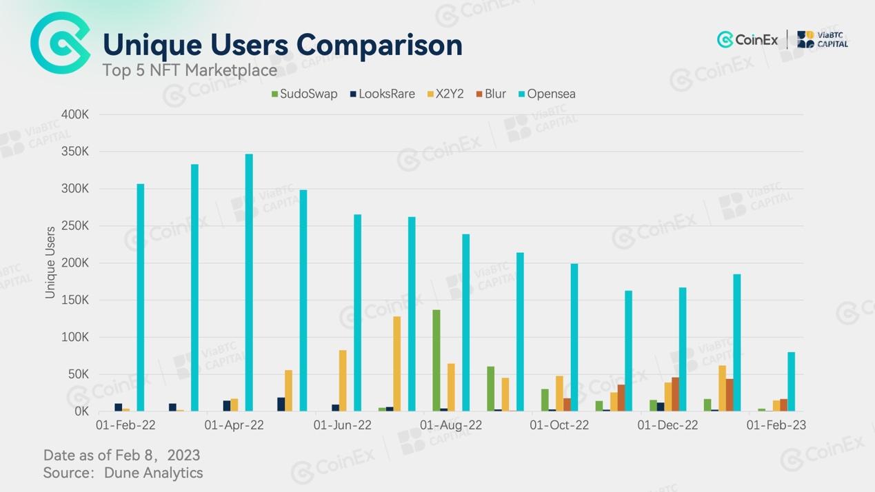 Mengenai pengguna unik, Blur dan X2Y2 bersaing ketat, sementara LooksRare tertinggal. Sementara itu, SudoSwap, yang mencapai 100.000 pengguna unik di bulan Agustus, mengalami penurunan.