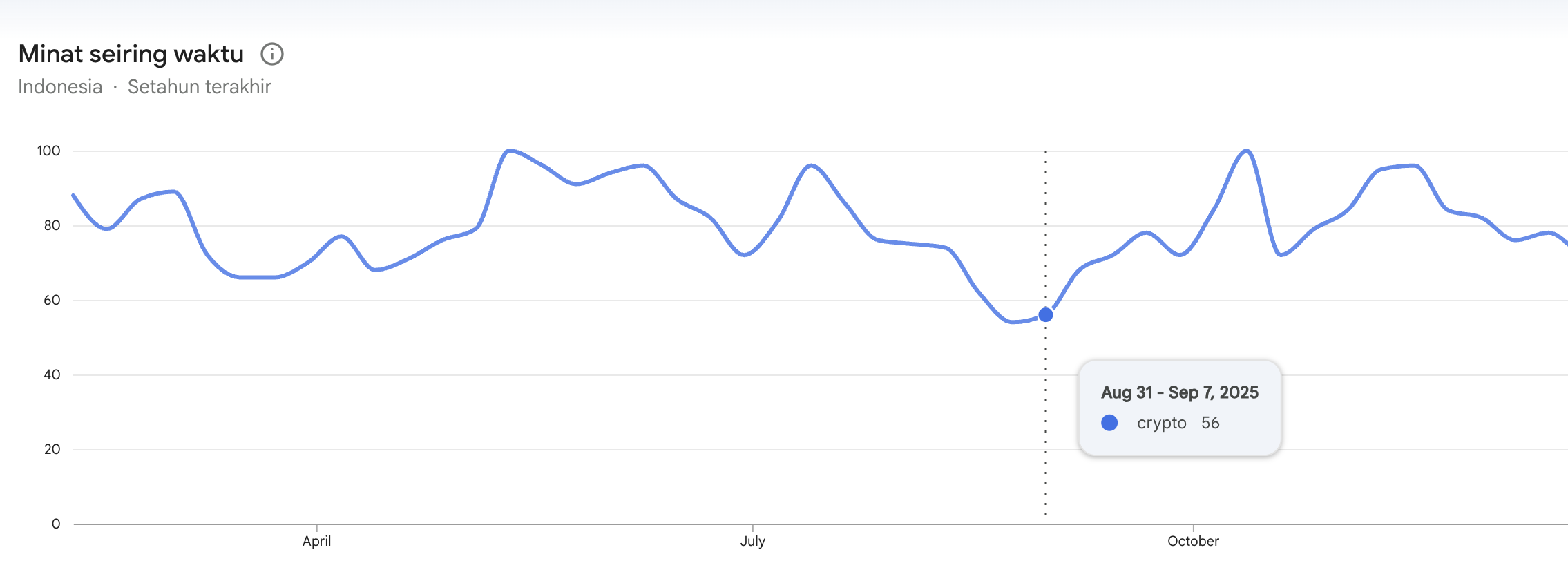 Tren serupa juga terlihat di Indonesia. Volume pencarian “crypto” di Indonesia sempat mencapai skor 100 pada Oktober 2025, namun kemudian turun ke bawah ke level 55 pada Februari 2026.