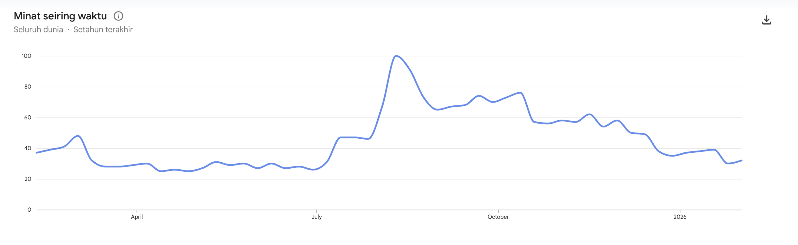 Level terendah tahunan pencarian di Indonesia berada di skor 54 di bulan Agustus 2025.