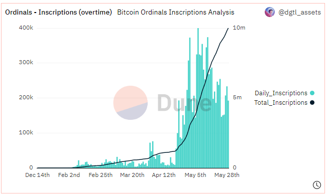 Menurut data Dune Analytics, lebih dari 10 juta inskripsi telah dibuat hingga saat ini, yang 90% di antaranya adalah token BRC-20. Karena inskripsi BRC-20 hanya berupa file teks JSON yang memanfaatkan diskon ruang data SegWit hingga 75%, ukurannya lebih kecil, hanya sekitar 405 byte.