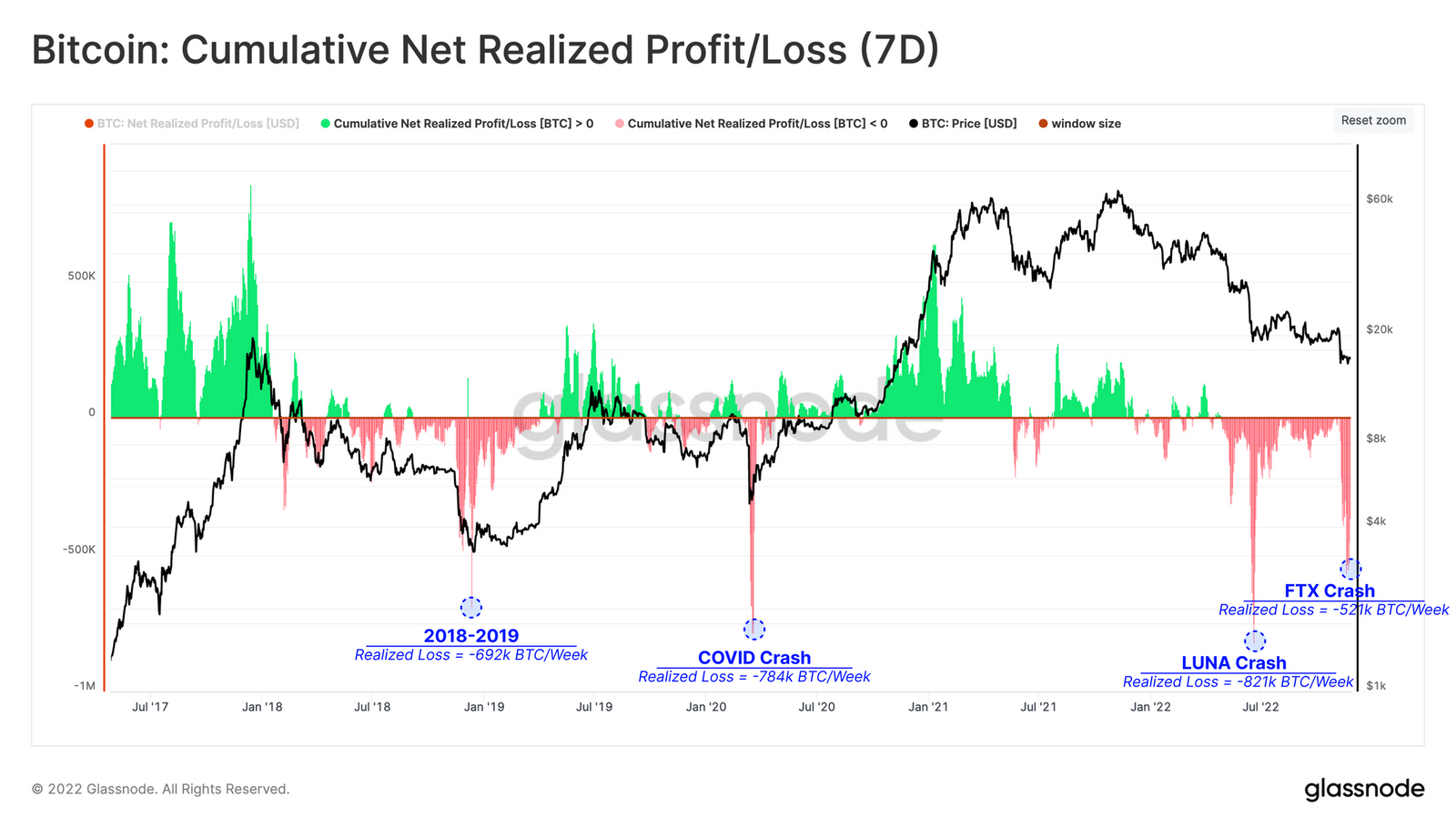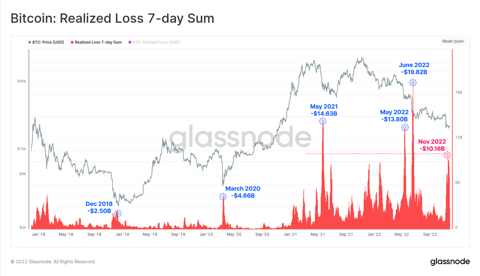 Menurut Glassnode, pada November 2022, kerugian terealisasi (realized loss) Bitcoin mencapai $10,16 miliar per pekan. Angka ini empat kali lipat lebih besar dari realized loss pada Desember 2018 dan dua kali lebih besar dari realized loss pada Maret 2020.