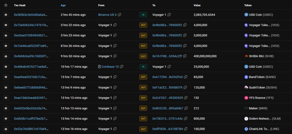 Sejumlah firma analitik mencatat aksi jual agresif kembali terjadi dalam 24 jam terakhir. Lookoncahin menghitung ada sekitar $56 juta aset kripto yang telah ditransfer dalam kurun waktu tersebut termasuk, 27.255 ETH ($42 juta), 11 juta VGX ($6.3 juta), 400 miliar SHIB ($4.4 juta), dan 160.000 LINK ($1 juta). Jumlah tersebut belum termasuk sejumlah kecil aset lainnya. Voyager juga menerima 33,7 juta USDC dari Wintermute Trading, Binance US, dan Coinbase.