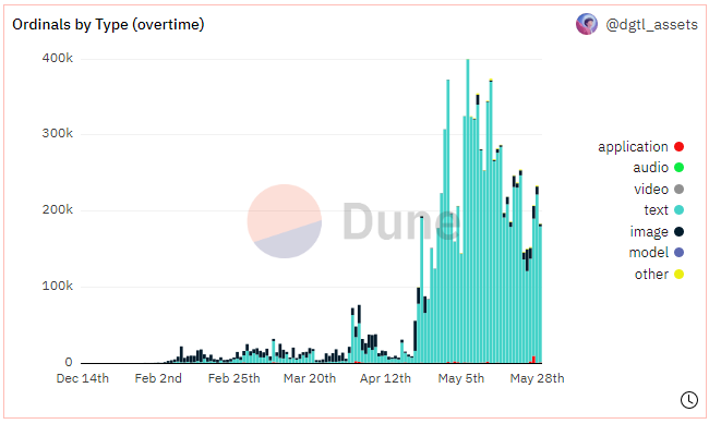 Namun pada April, tren inskripsi Ordinals berubah. Orang-orang mulai mencetak inskripsi berbasis teks melalui token standar BRC-20, yang diperkenalkan oleh seorang pseudonim penyuka data on-chain, Domo.