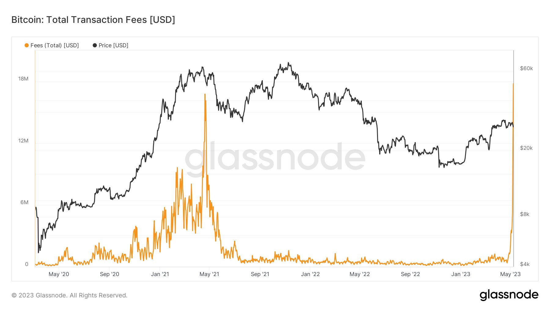 Biaya transaksi Bitcoin juga sudah melampaui gas fee Ethereum. Fee Bitcoin tercatat melonjak hingga $30 pada 8 dan 9 Mei 2023, lebih tinggi dari fee saat bull market 2021.