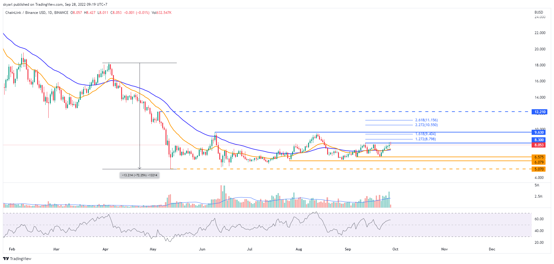 LINK berada pada fase uptrend setelah berhasil bergerak diatas 20-day exponential moving average (EMA). Saat ini pergerakan harga LINK terlihat berada pada resistance di level $8,300.