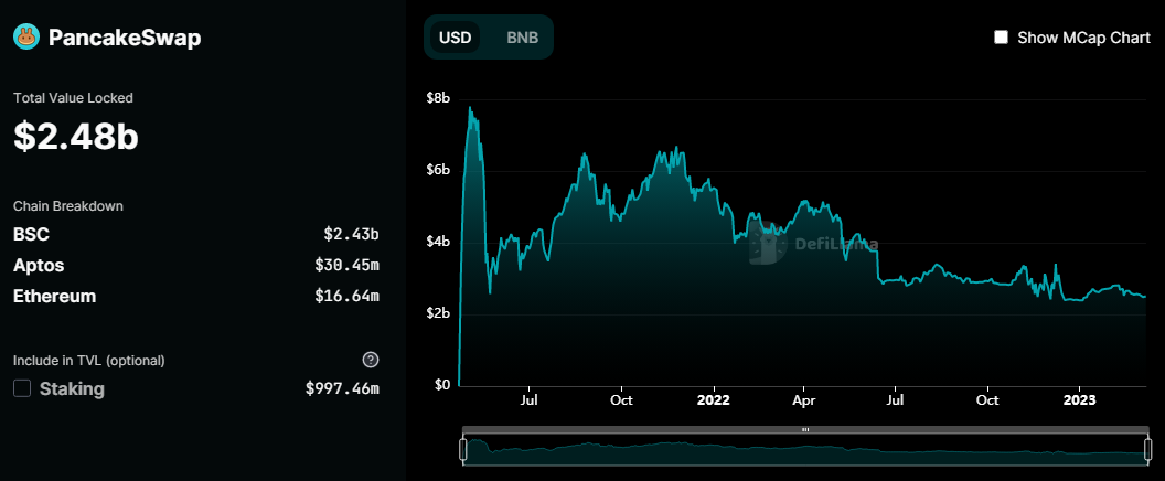 Menurut DefiLlama, TVL PancakeSwap saat ini mencapai $2,48 miliar dari tiga blockchain. Jumlah ini sebenarnya sudah $5 miliar dari Mei 2021.
