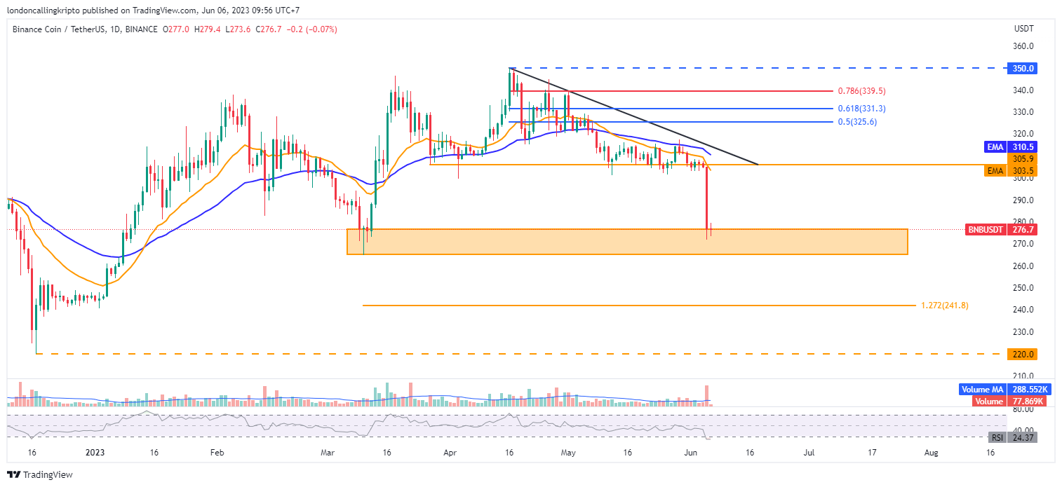 BNB mengalami penurunan harga yang signifikan setelah berita gugatan terhadap Binance yang diajukan oleh Komisi Sekuritas dan Bursa Amerika Serikat (SEC) muncul ke publik.