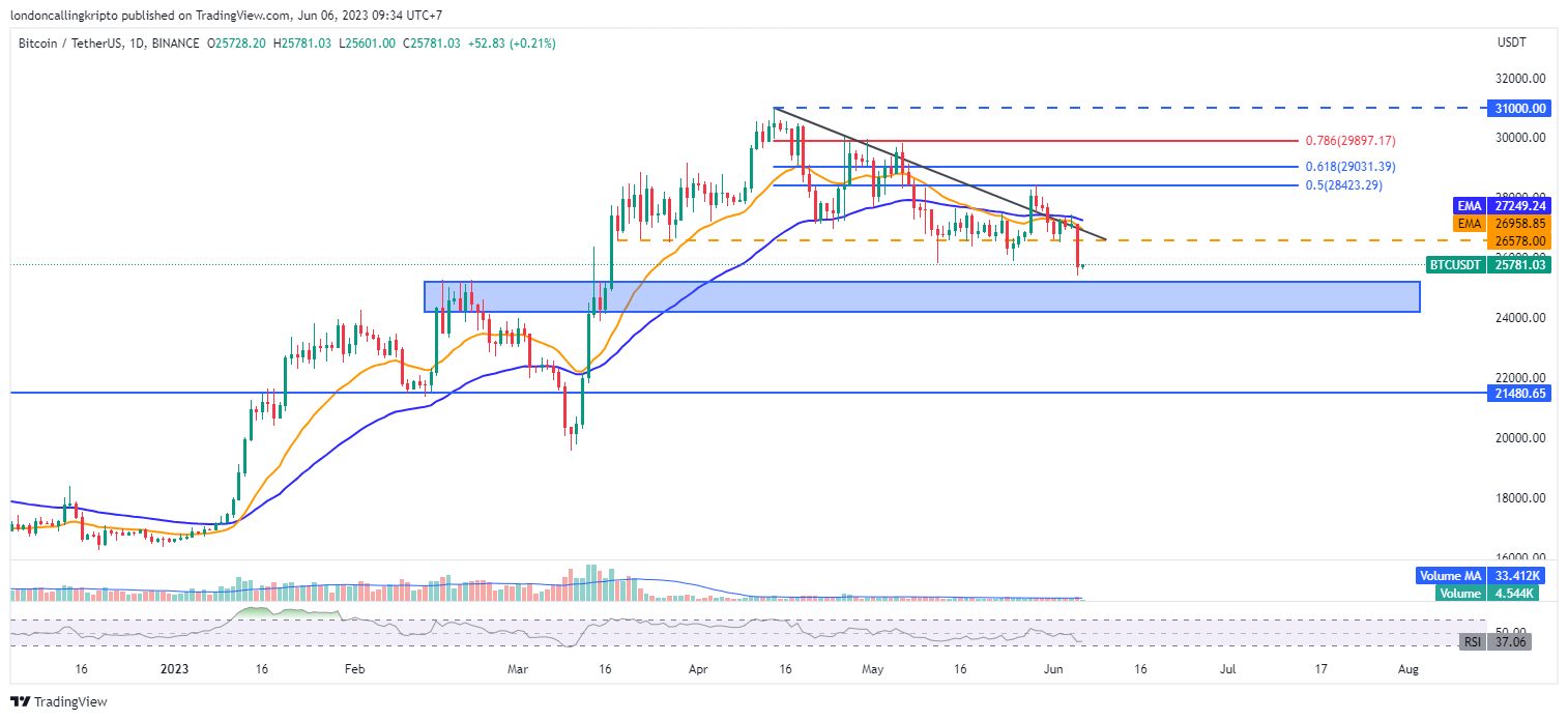 Penurunan harga Bitcoin saat ini bahkan berhasil breakdown harga terendah pada penutupan kandil harian 18 Maret di level $26.578 yang saat ini berubah fungsi menjadi resistance terdekat.