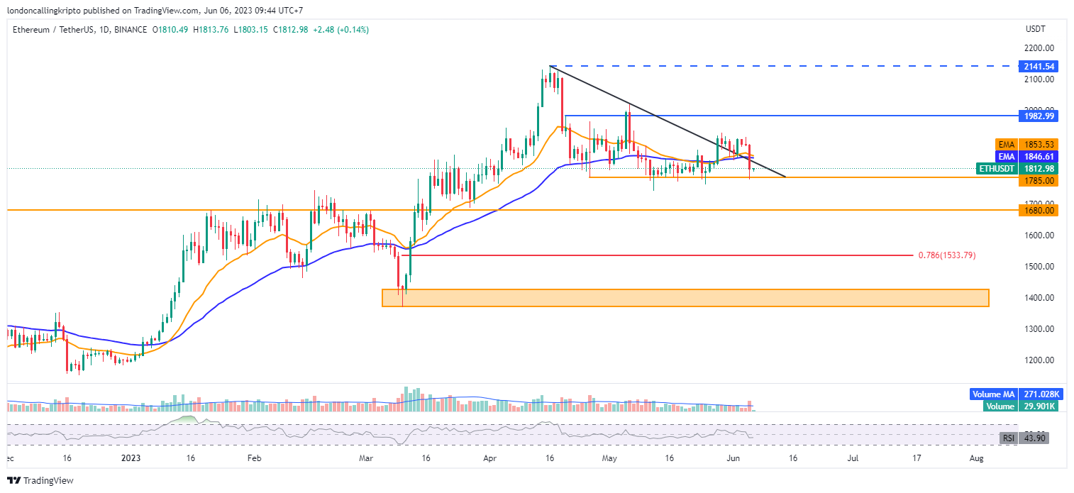 Pergerakan harga ETH mengalami penurunan yang cukup masif sehingga berhasil breakdown 20-day EMA. Selain itu, penurunan harga ETH kembali retest support yang merupakan harga terendah pada penutupan kandil harian 26 April di level $1.785.