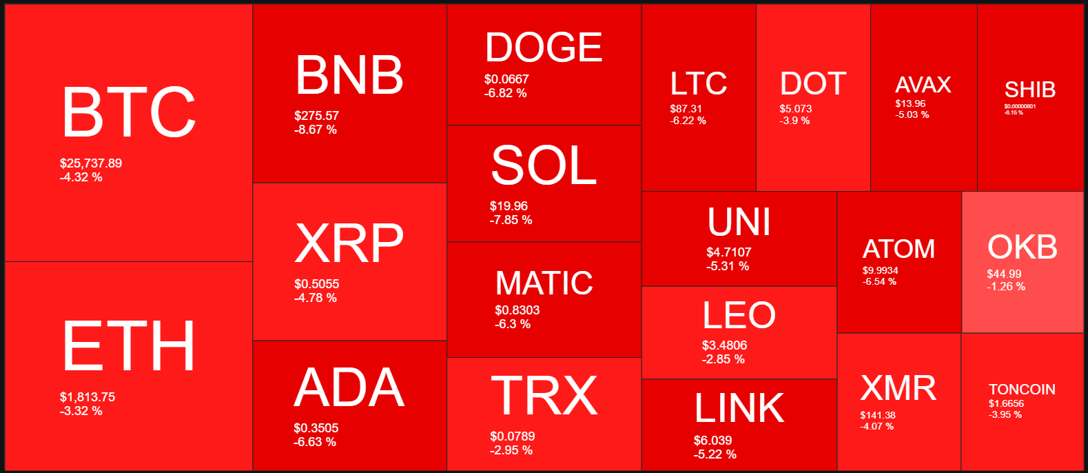Berita tersebut menjadi fundamental negatif bagi keseluruhan pasar kripto. Tiga aset utama pasar kripto mengalami penurunan yang signifikan, seperti Bitcoin dengan penurunan sebesar 5,12%, ETH turun sebesar 4,21%, dan BNB mencatatkan penurunan sebesar 9,21%.