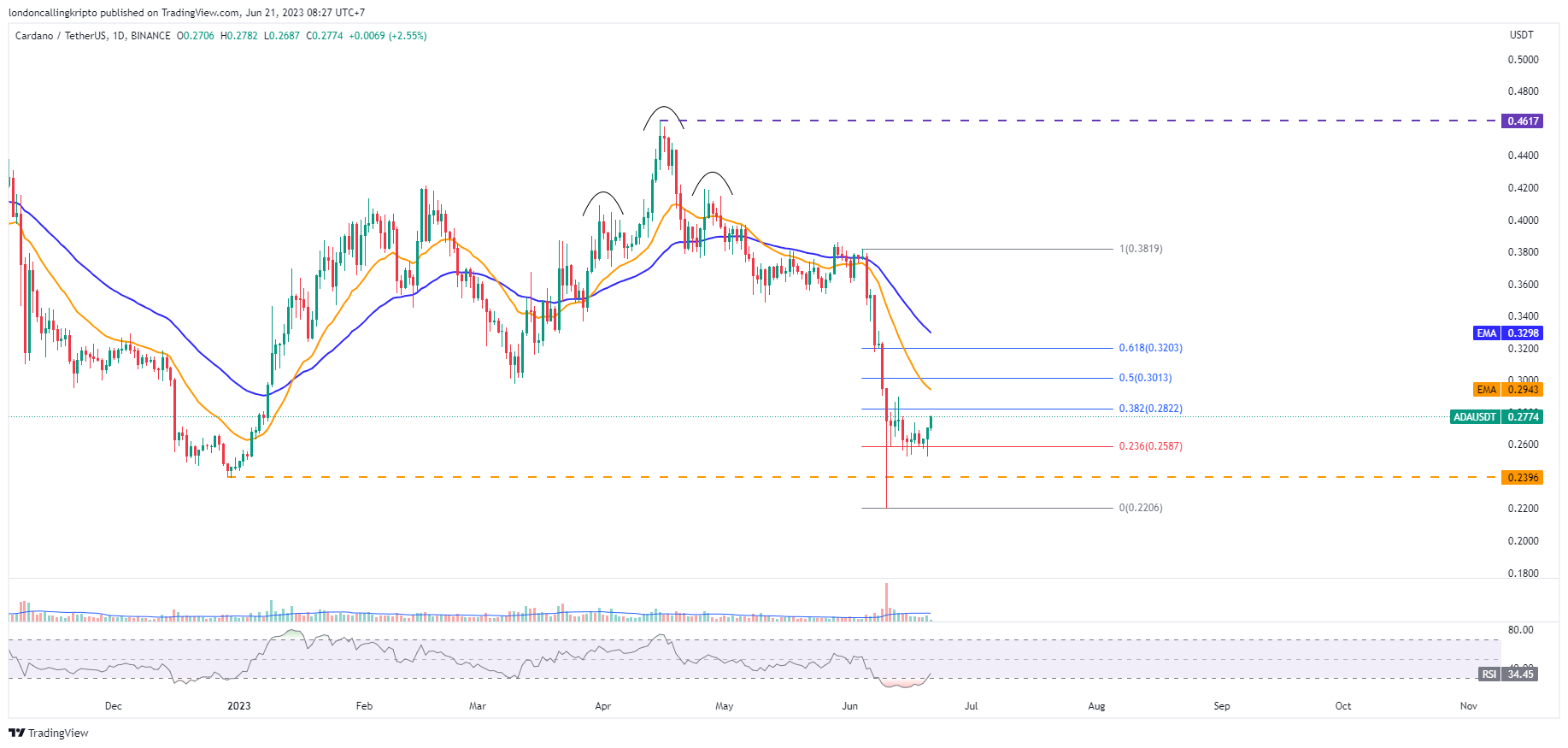 Penurunan harga pada 10 Juni berhasil melewati major support yang merupakan harga terendah pada penutupan kandil harian 29 Desember 2022 di level $0,2396. Tetapi harga berhasil rebound dan ditutup diatasnya.
