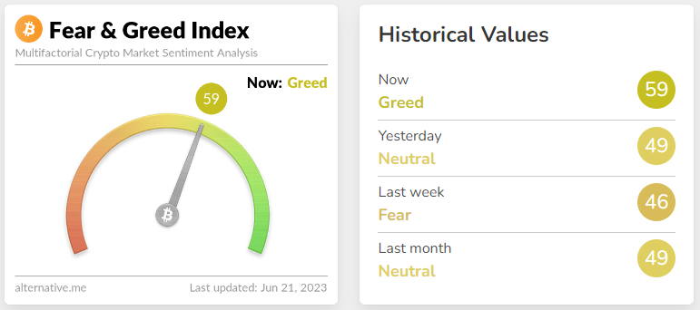 Kondisi pasar kripto saat ini berhasil mendongkrak kepercayaan diri pelaku pasar. Hal tersebut terlihat dari Fear and Greed Index yang mengalami kenaikan sebesar 10 poin, ditutup pada level 59 dengan kategori Greed.