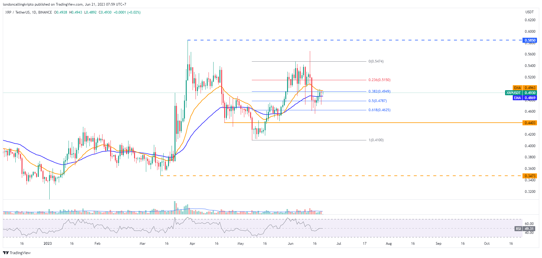 Kenaikan harga tersebut berhasil breakout dinamis resistance yang merupakan 50-day exponential moving average (EMA) di level $0,4870 dan menyentuh dinamis resistance pada 20-day EMA di level $0,4965.