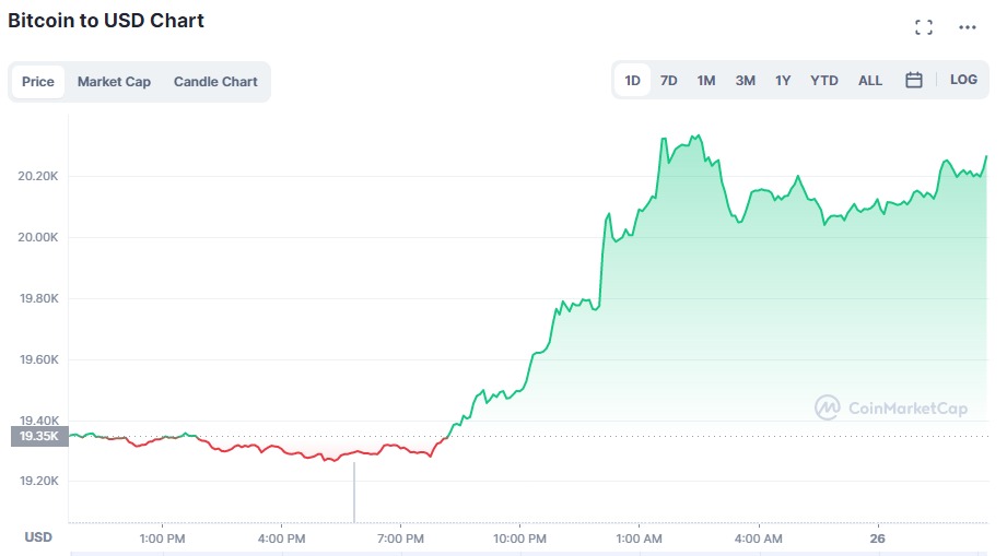 Portalkripto.com —Â Pasar kripto kembali menggeliat pada Rabu, 26 Oktober 2022, setelah mengalami volatilitas cukup rendah selama beberapa pekan terakhir. Menurut data CoinMarketCap, Bitcoin (BTC) berhasil naik 5% mencapai $20.000 sebagai titik resistance untuk pertama kalinya sejak 7 Oktober lalu.