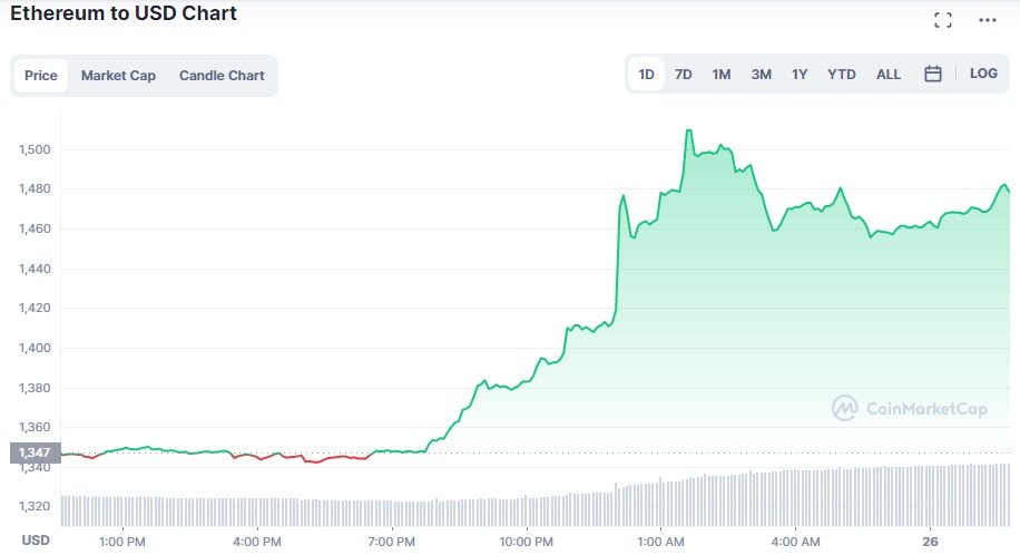 Sementara Ethereum (ETH) mencatat kenaikan yang lebih tinggi sebesar 11% dalam 24 jam terakhir. ETH sempat menyentuh $1.500 untuk pertama kalinya sejak The Merge pada pertengahan September lalu. Saat ini ETH diperdagangkan di harga $1.485.