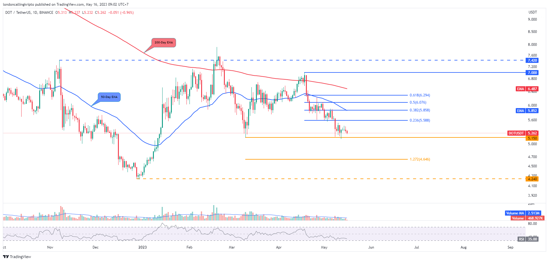 Tetap diperhatikan kemungkinan jika penurunan harga DOT berhasil breakdown support terdekatnya saat ini. Jika hal itu terjadi, maka pergerakan harga DOT akan mengalami penurunan lebih dalam dengan support selanjutnya berada pada level $4,646.