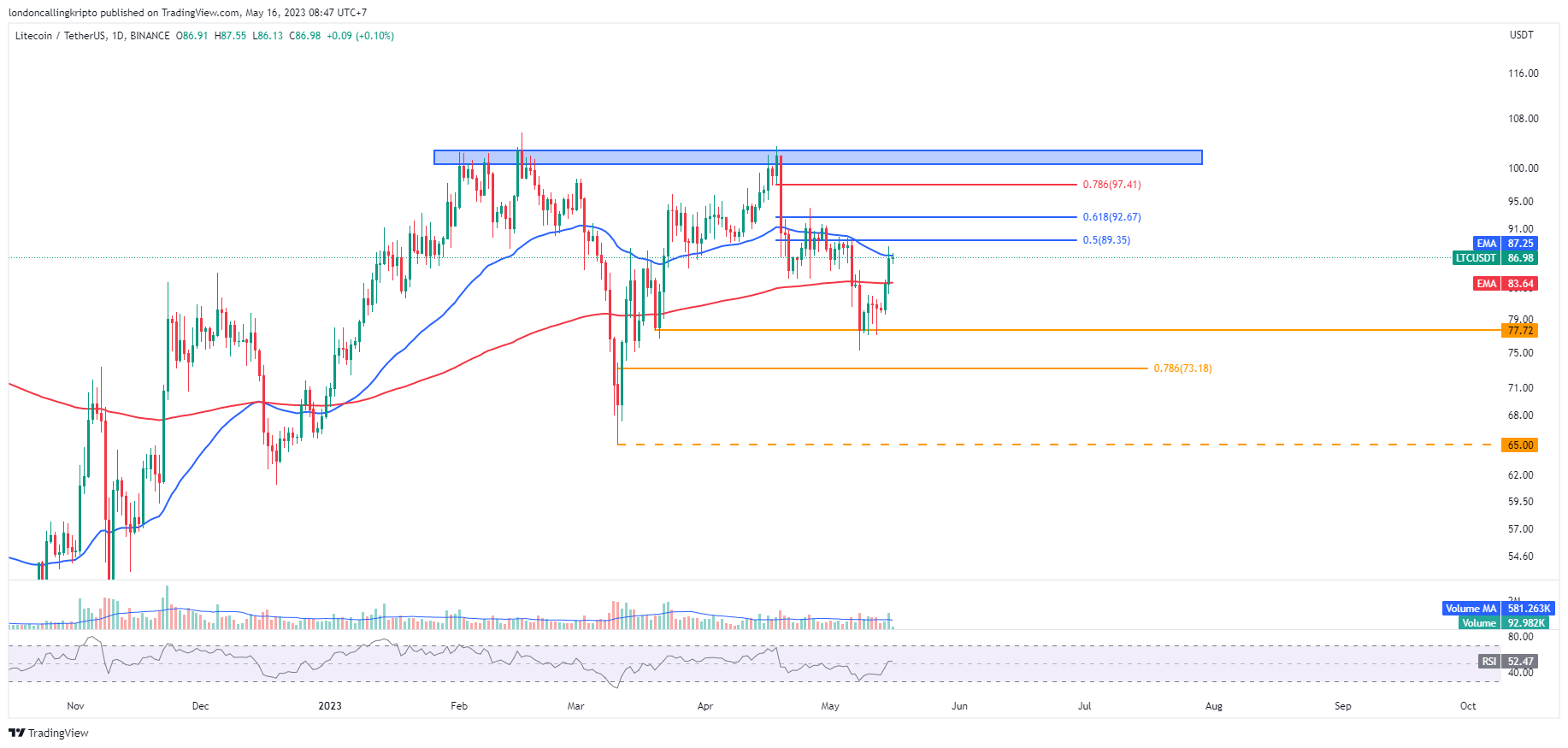 Meskipun terjadi tarik ulur yang cukup ketat, tetapi harga LTC berhasil melanjutkan kenaikan harga-nya. Pergerakan harga LTC kembali menyentuh 200-day EMA di level $83,64 pada penutupan kandil harian 14 Mei.
