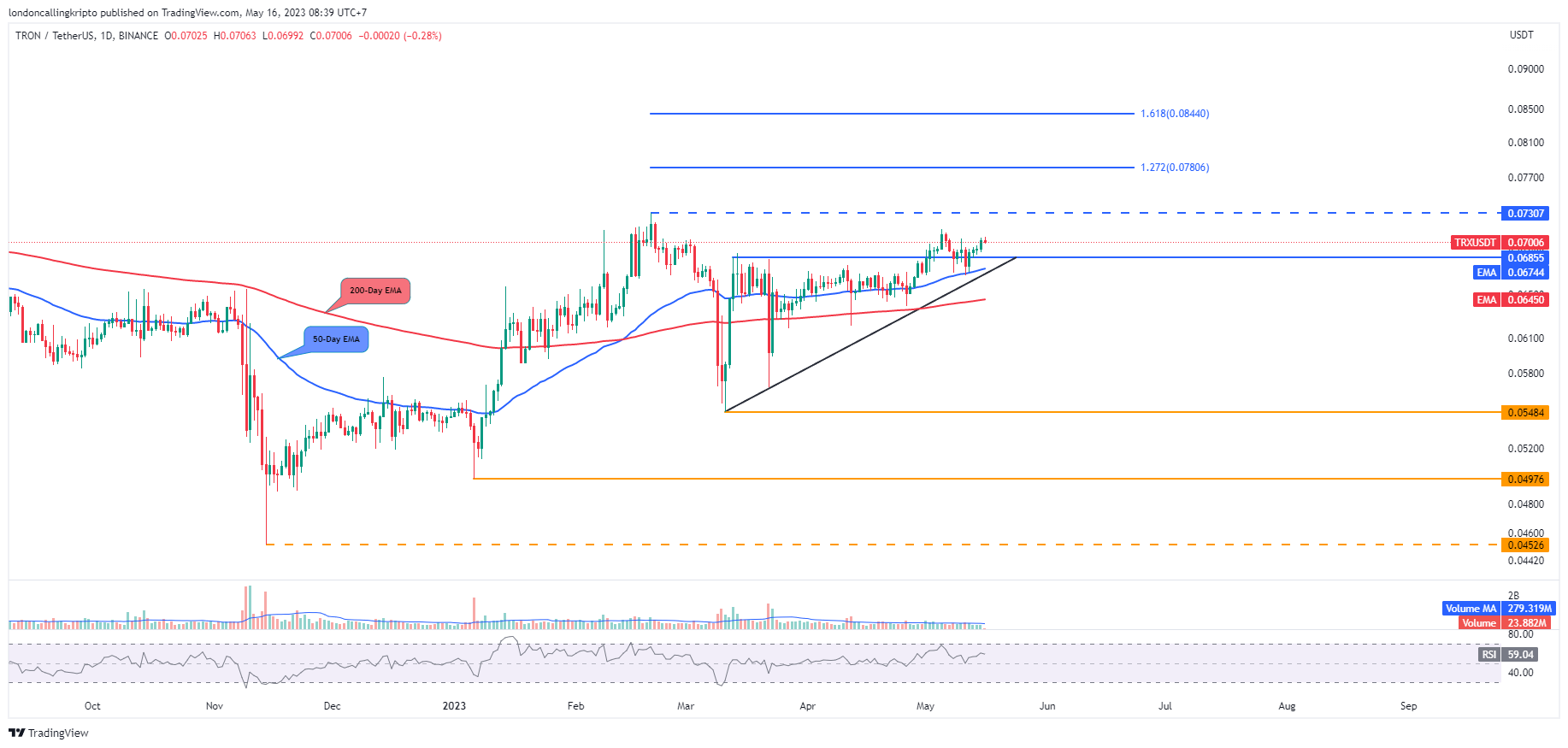 Laju bullish TRX berpotensi melewati harga tertinggi pada penutupan kandil harian 5 Mei di level $0,07137. Jika hal itu terjadi, maka kenaikan harga TRX diprediksi bisa mencapai resistance selanjutnya di level $0,07307.