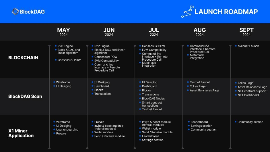 Dalam tahap-tahap selanjutnya dari rencana jalan, BlockDAG mempersiapkan acara-acara besar seperti peluncuran Devnet, Testnet, dan Mainnet. Ini dirancang untuk menyempurnakan dan mengamankan infrastruktur blockchain melalui pengujian dunia nyata, audit keamanan, dan uji coba beta. Langkah-langkah ini memastikan keandalan platform dan kesiapan untuk peluncuran publik.