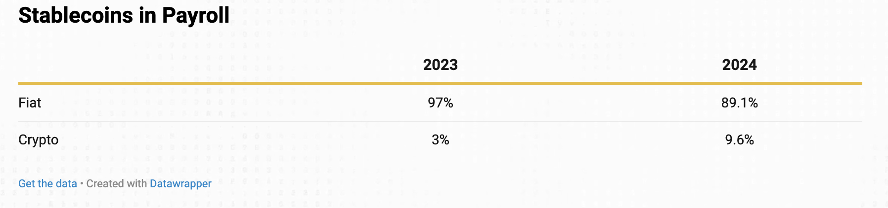 Dalam laporam tersebut ditulis, bahwa tahun lalu, hanya 3% responden yang menerima gaji dalam kripto, namun tahun ini melonjak menjadi 9,6%. Stablecoin menjadi metode pembayaran paling dominan, dengan USDC (63%) dan USDT (28,6%) sebagai pilihan utama.