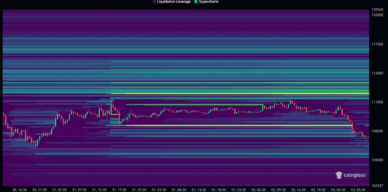 “Ada dua level likuiditas besar yang terbentuk selama akhir pekan,” tulisnya. “Harga telah menembus batas bawah di $108.500, tapi masih ada kluster likuiditas di sekitar $112.000. Jika dilihat lebih luas, area $105.000–$106.000 dan $117.000 menjadi level penting yang perlu diperhatikan.”