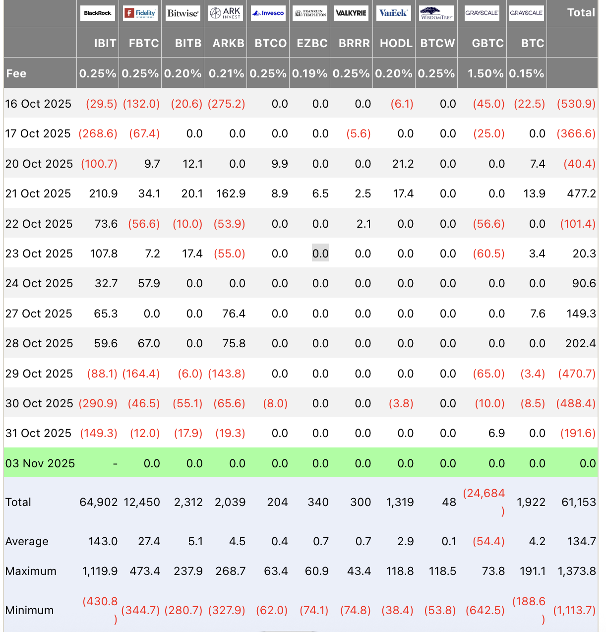 Minat institusional terhadap Bitcoin kembali disorot setelah harga BTC tertinggal dibanding saham dan emas. Data Farside Investors menunjukkan tiga hari berturut-turut net outflow dari ETF Bitcoin spot AS hingga 31 Oktober, dengan dana BlackRock (IBIT) menyumbang lebih dari $500 juta dari total penarikan.