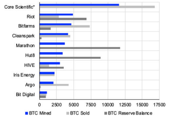Untuk Core Scientific, Bitfarms, Cleans Park, Iris Energy, Argo, dan Bit Digital, Bitcoin yang dijual lebih banyak daripada yang ditambang. Hanya dua penambang besar yang sama sekali tidak menjual Bitcoin di 2022, yakni Marathon dan Hut8.