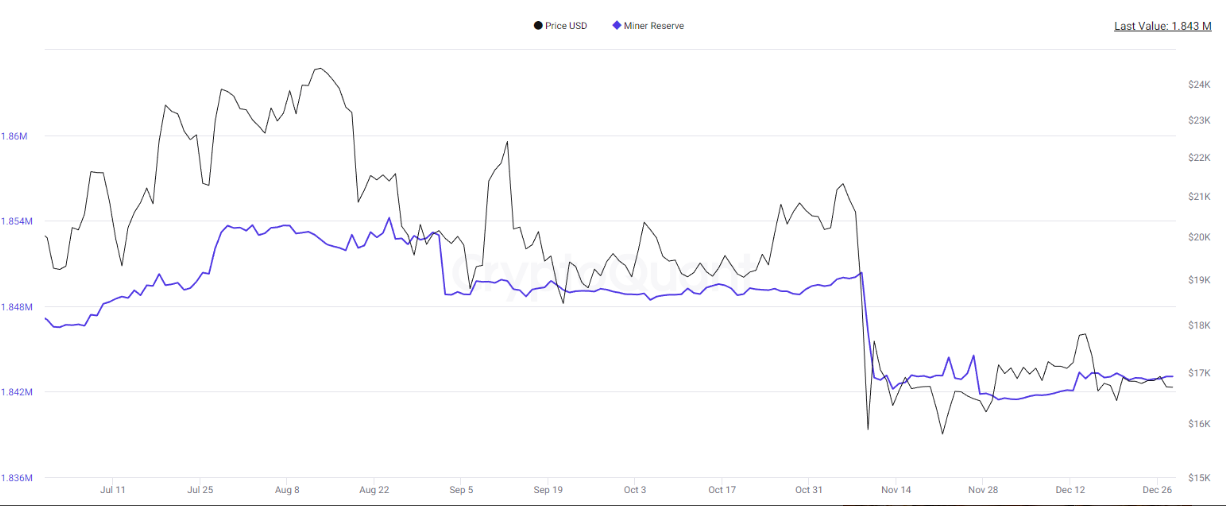 Menurut data CryptoQuant, jumlahnya melorot dari kisaran 1,854 juta BTC menjadi 1,842 juta BTC. Pada Desember ini, kenaikan miner reserves hanya sebesar 1%.