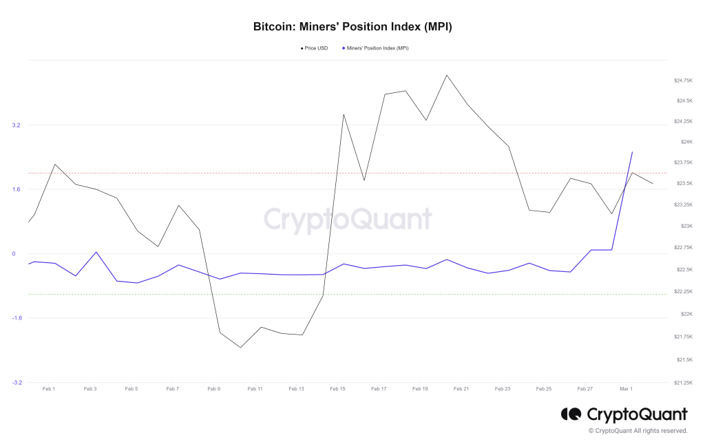 Indikator lainnya, Bitcoin Miners Position Index (MPI) juga memperlihatkan grafik peningkatan cukup tajam sejak 28 Februari. MPI ini mengukur arus keluar BTC dari dompet penambang ke bursa secara relatif terhadap rata-rata pergerakan satu tahun. Lonjakan pada grafik MPI mengindikasikan sinyal bearish lantaran penambang mentransfer BTC simpanan mereka lebih dari biasanya.