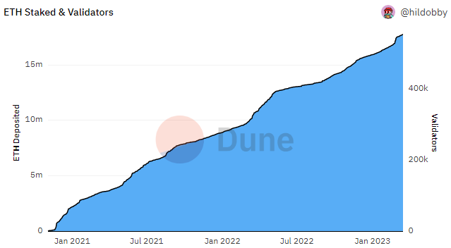 Jumlah staked ETH dan validator per 16 Maret 2023. (sumber: Dune)