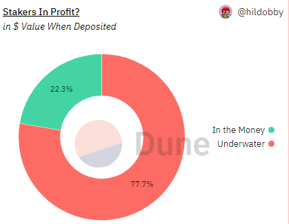 Namun, menurut data Dune, ternyata hanya 22,3% validator yang akan meraup untung, jika harga ETH masih sideways sampai sebulan ke depan. Sementara 77,7% sisanya akan buntung.