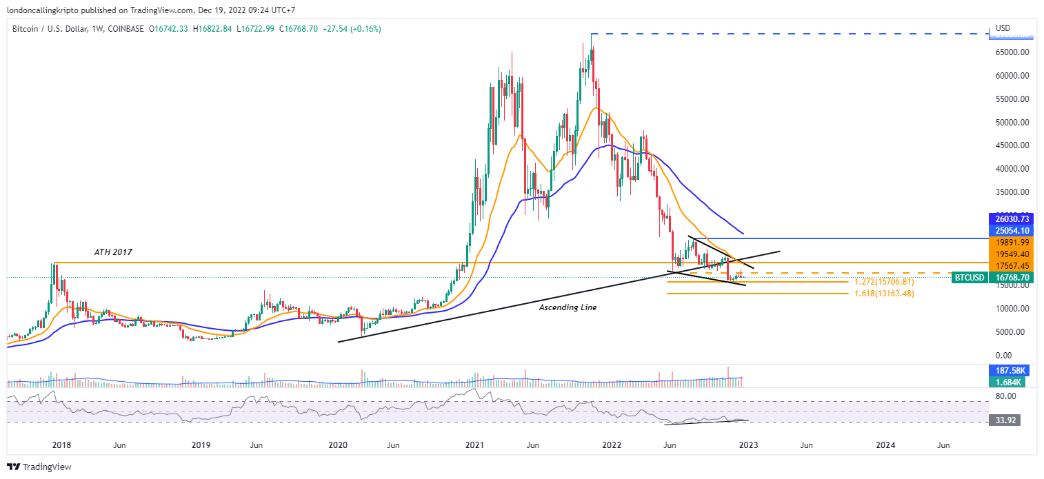 Weekly candle BTC pagi ini ditutup pada harga $16.741, level tertinggi berada pada harga $18.385 dan level terendah berada pada harga $16.529.