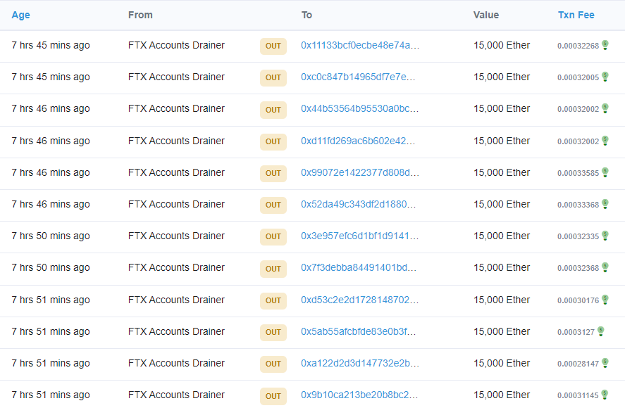 Pergerakan ini terpantau terjadi pada pukul 23.11-23.17 WIB, 21 November 2022. Masing-masing wallet menerima 15.000 ETH dengan total nilai sekitar $199,3 juta.