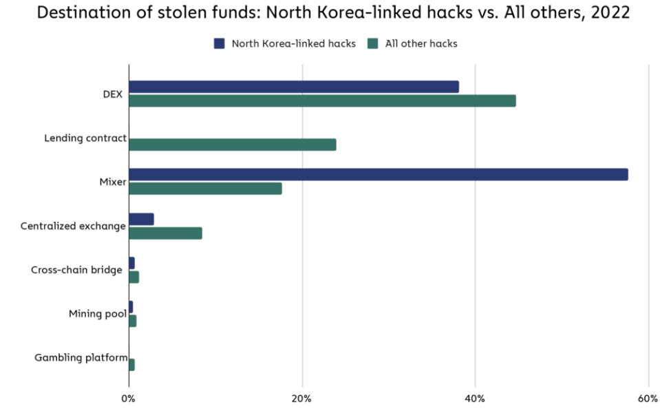 Mereka juga memilih untuk mentransfer dana curian ke platform pencampur (mixer) kripto untuk mengaburkan jejak transaksi. Protokol mixer yang paling populer digunakan oleh peretas Korea Utara adalah Tornado Cash dan Sinbad.