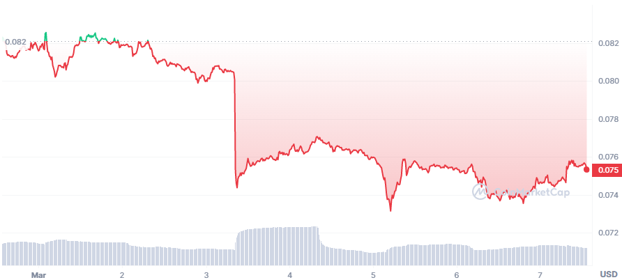 Portalkripto.com —Â Harga Dogecoin (DOGE) terpantau turun cukup signifikan dalam sepekan terakhir. Menurut data CoinMarketCap, DOGE telah mengalami penurunan hingga 8,5% dalam tujuh hari dan kini diperdagangkan di harga $0,07562.