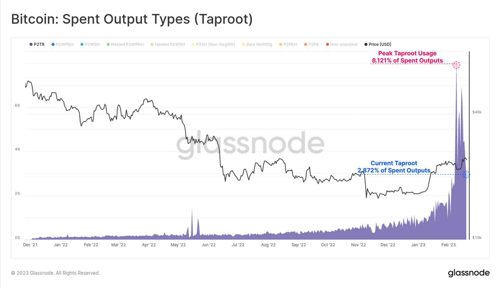 Perlambatan ini terlihat dalam adopsi Taproot yang juga menurun hingga 65% dari all-time high (ATH)-nya pekan lalu. Taproot adalah jenis skrip Bitcoin terbaru yang dapat memfasilitasi transaksi yang lebih privat dan aman, sekaligus meningkatkan skalabilitas.