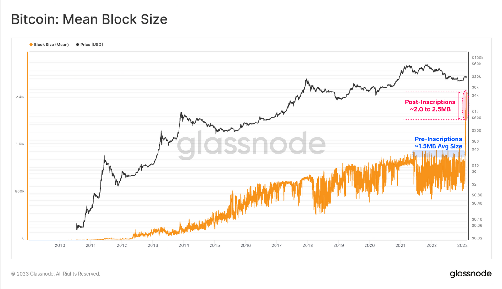 Meski volume transfer BTC-nya hanya sedikit, Inskripsi nyatanya tetap berpengaruh pada ukuran block Bitcoin. Setelah ada Ordinals, ukuran rata-rata block yang ditambang naik dari 1,5 megabyte menjadi 2,0-2,5 megabyte.