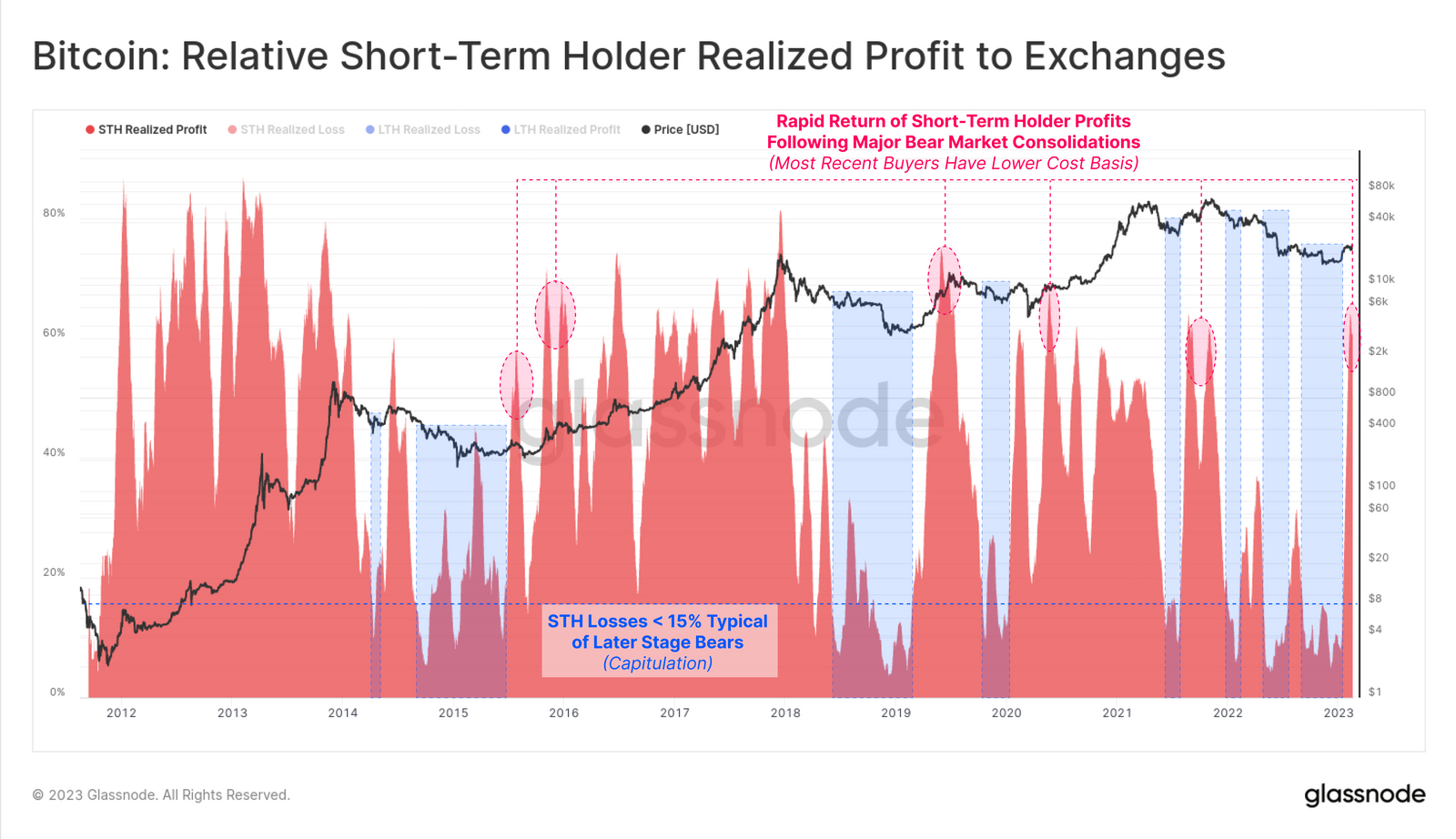 Sentimen bullish juga dilihat dari banyaknya STH yang mendulang untung setelah menjual kriptonya di exchange pada tahun ini. Keuntungan STH dari hasil konsolidasi bear market ini membentuk pola yang sama dengan beberapa siklus bear-bull market sebelumnya.