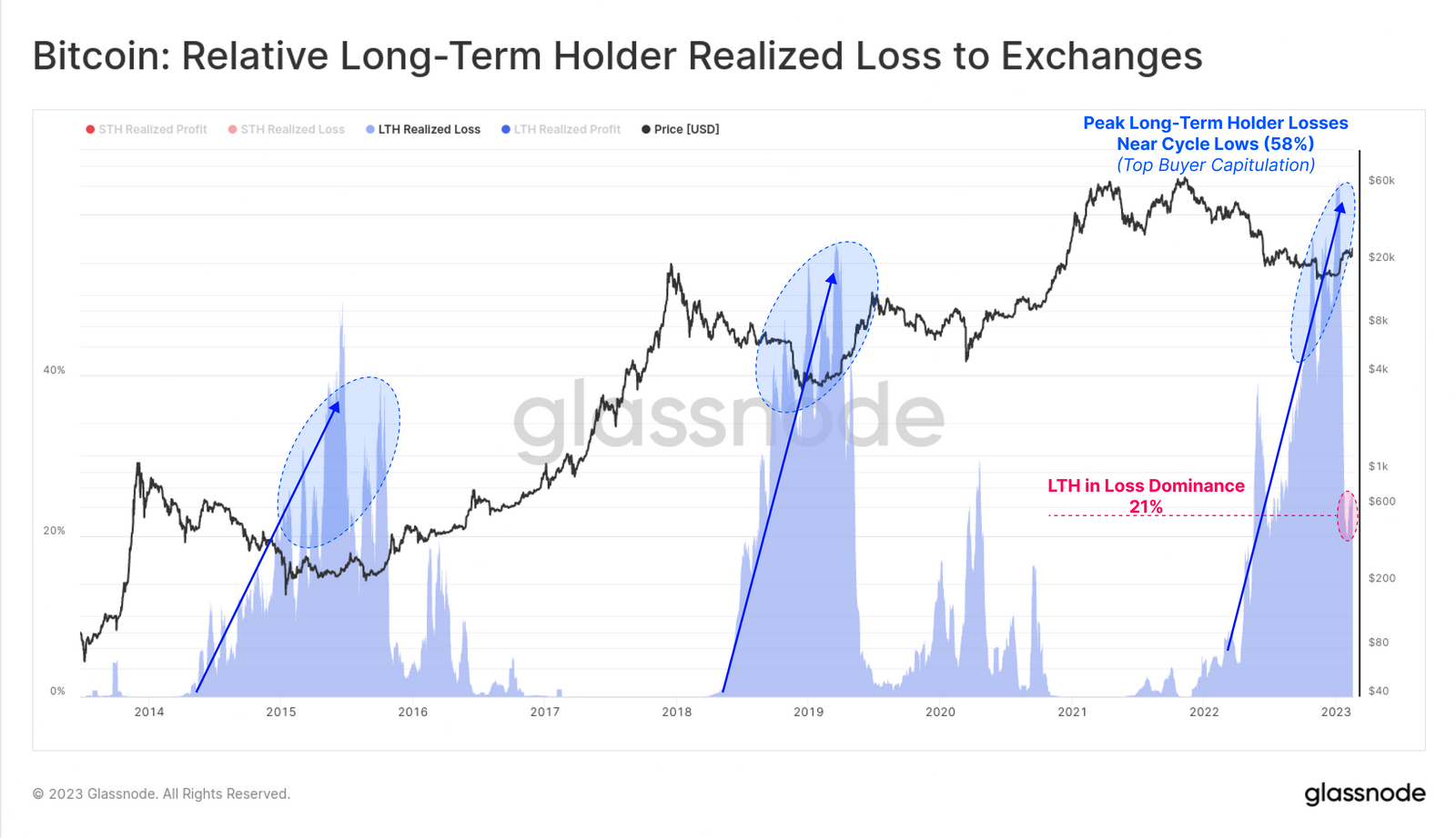 Menurut data Glassnode, kerugian LTH mencapai puncaknya pada pertengahan Januari 2023 dengan dominasi 58%. Namun, angka itu telah menurun saat ini menjadi 21%.