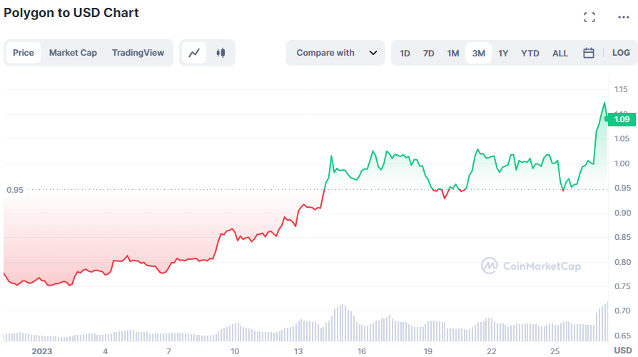 MATIC berhasil melonjak hingga 48% sejak 31 Desember 2022 dan kini diperdagangkan di harga $1,09. Lonjakan ini disebabkan oleh tingginya transaksi harian yang berlangsung dalam jaringan.